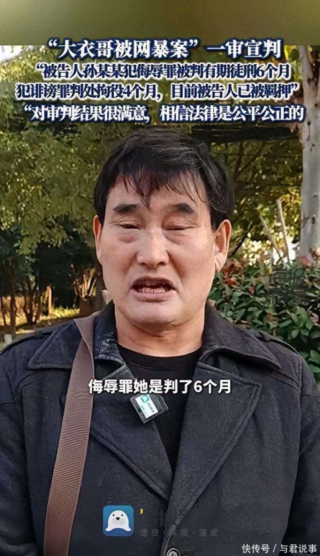 11月1日,大衣哥状告女子网暴一案开庭审理。大衣哥律师透露: 被告人孙某某犯侮辱罪判处有期徒刑6个月, 犯诽谤罪判处拘役4个月, 两罪合并执行有期徒刑6个月