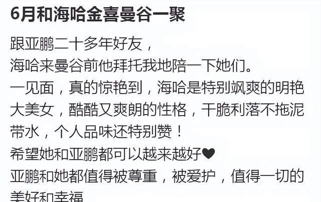 陪着海哈金喜母女在曼谷玩了好几天的李亚鹏好友,通过这几天相处,海哈金喜给她留下很好的印象。李亚鹏友人就夸海哈金喜是个飒爽明艳的大美女,性格爽朗干脆利落不拖泥带水,个人品味还特别赞,总之,她和李亚鹏都是很好的人,都是值得被尊重,被爱护的人。